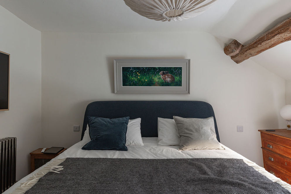 A spacious master bedroom with a luxurious super-king bed, ample storage and furnished with antiques from wales and the local region. The floors are original, hand stripped elm, and during the restoration we revealed a beautiful stone fireplace that had previously been in-filled, plastered and papered with wood-chip wallpaper.